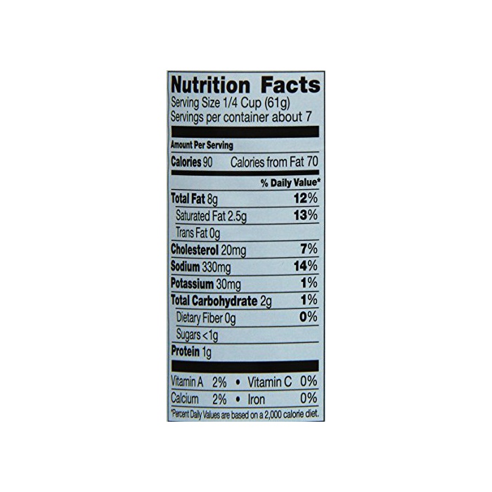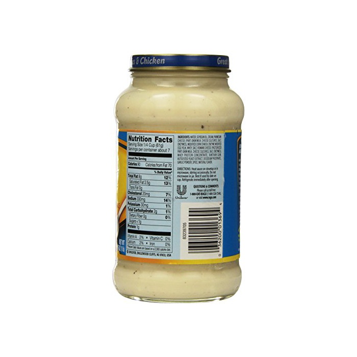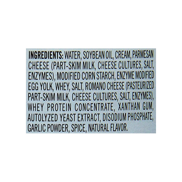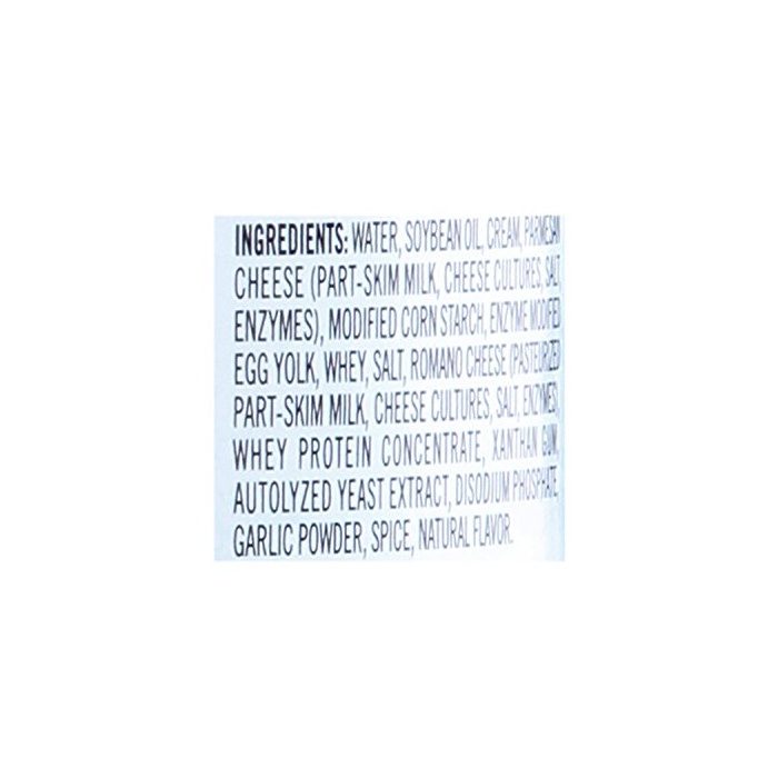 원재료:크림(유제품)고, 대두유,파르메잔 치즈,계란 노른자,《호에이》(유제품)고, 단백질 농축《호에이》(유제품)고, 식염,로마《―노치즈》,이스트 엑기스,분말 마늘,흑후추,증점제(가공 전분)고, 유화 제(인산Na)고, 안정 제(산탄검(Xanthan Gum))고, 향료