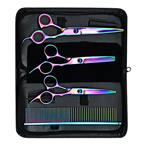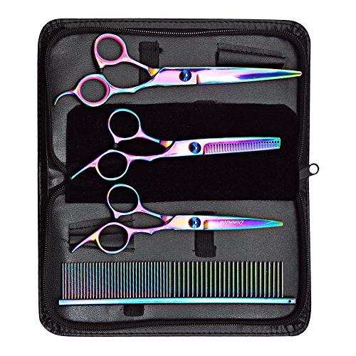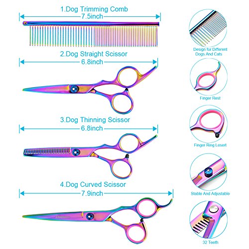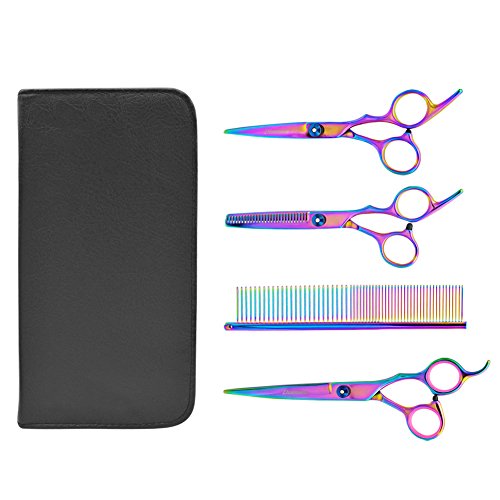 This 4-piece Pet Grooming Scissors Kit contains high quality stainless steel Dog Straight Edge Scissor, Dog Thinning Scissor,Cat Curve Scissor and Pet Grooming Comb,they will cover your basic everyday grooming needs.