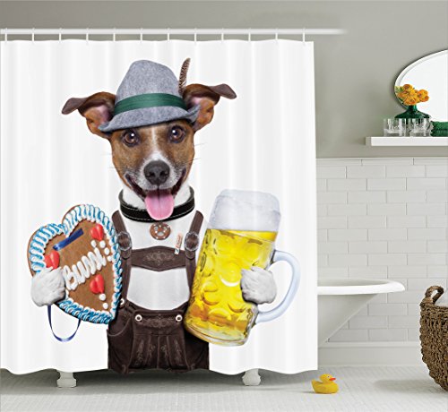 Ambesonne Festival Decorations Collection, Oktoberfest Dog with Beer Mug and Gingerbread Heart, Smiling Happy Times Art, Polyester Fabric Bathroom Shower Curtain Set with Hooks, Yellow Brown