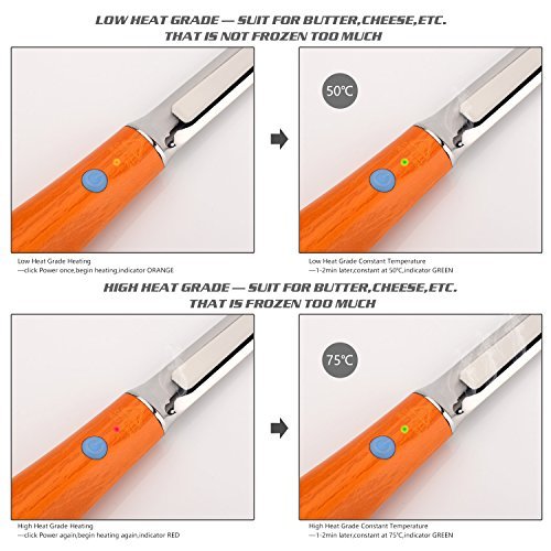 - 【2 Heat Grade, Easy to Use】One is Low Heat Grade(about 50℃,for the butter not so frozen), indicator will turn from Orange(heating process) into Green (constant at 50℃) after 1-2 minutes. Another is High Heat Grade(about 75, for more frozen butter), indicator will turn from Red(heating process) into Green(constant at 75℃) after 1-2minutes.Pushing the button again and again,the 2 mode will switch correspondingly.