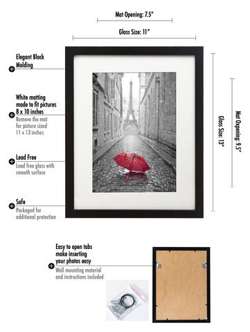 -. Feature : STYLISH DESIGN: 11x13-inch photo frame for your home, office, studio or gallery. Beautifully display your treasured memories and outstanding art with this sleek design. Ideal for photos sized 11x13 and 8x10 with mat. / USE AND DISPLAY: Elegantly display your pictures, perfect for your home, office, studio, gallery or dorm room. Display your picture either with the 8x10 inch white mat or 11x13 inch without the mat. / QUALITY: Sturdy frame made to last. Clear glass front preserves and protects your picture. The actual mat opening is 7.5x9.5 inches. It is designed to hold a 8x10 inch photo in place. We recommend taping the photo to the back of the mat. / FEATURES: Hanging hardware included. Easy-open tabs allow you to load your picture quickly and fit securely. / PROTECTIVE PACKAGING: Americanflat developed packaging that helps ensure safe delivery of fragile and glass items. Order with confidence, click and add to cart today.