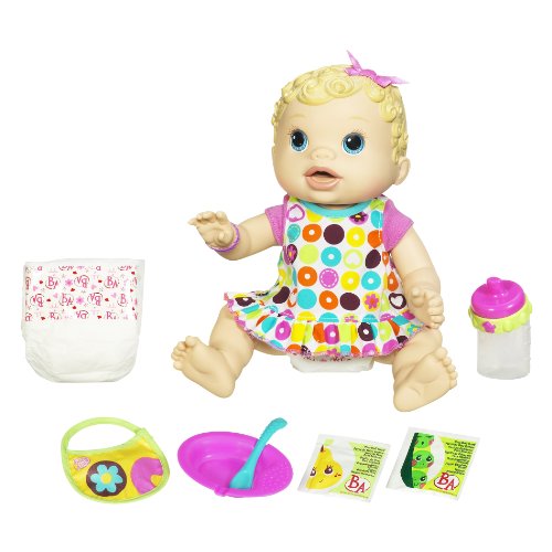 -. Feature : Clean her up and change her into her new "diaper" / She's ready to play and cuddle with her "mommy" / Adorable, realistic doll moves, makes baby sounds, and "pees" and "poops" after you "feed" her / Mix up her "food" and change her "diaper" like a good mommy / Baby Alive doll comes with 2 packets of doll food mix and bowl, spoon, bottle, 2 diapers, dress and bib accessories
