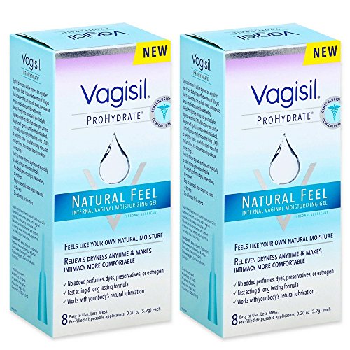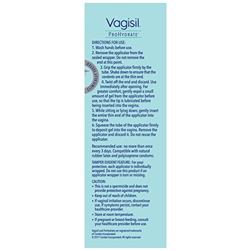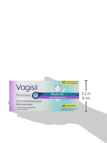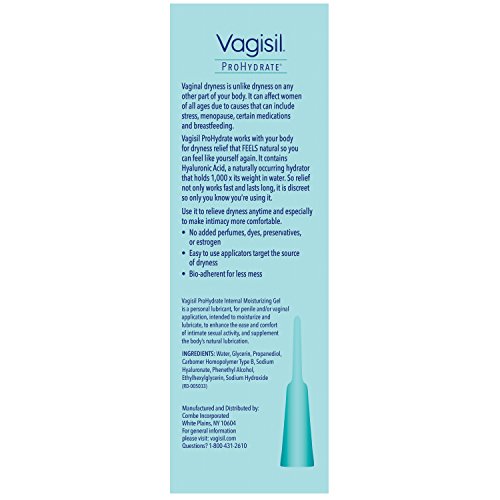 Vaginal dryness is unlike dryness on any other part of your body. It can effect women of all ages due to causes that can include stress, menopause, certain medications and breastfeeding. Vagisil Prohydrate works with your body for dryness relief that FEELS natural so you can feel like yourself again. It contains Hyaluronic Acid, a naturally occurring hydrator that holds 1,000x its weight in water. So relief not only works fast and lasts long, it is discreet so only you know you're using it. Use it to relieve dryness at any time and especially to make intimacy more comfortable. 8 - Easy to use pre-filled applicators target the source of dryness Made in the USA.Feature