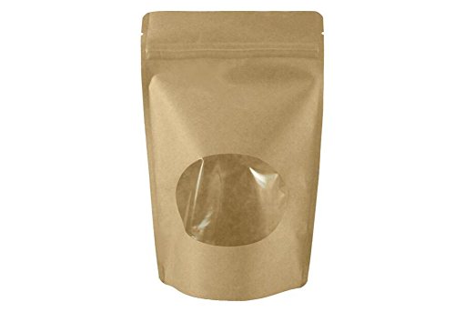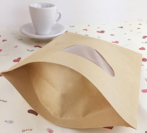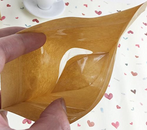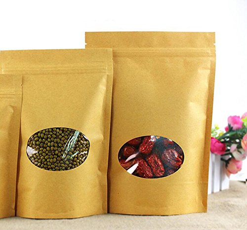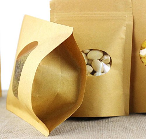 50pcs Craft Bags Pouches With Brown Paper shell, Stand-Up pouch and Zip Lock Closure With Window Cutout for Tea Nut and Candy Dried Fruits (5.1"W x 7.9"H)