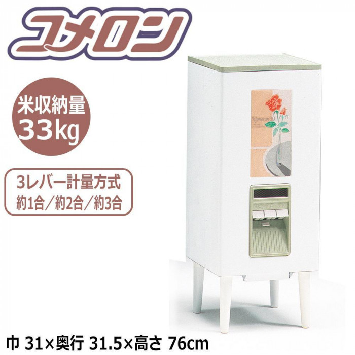 | 仕様 | 脚部のみ組立式 米びつ容量:33kg 計量装置:3レバー方式(0.18L・約1合、0.36L・約2合、0.54L・約3合) カバー付き計量口 計量ストッパー付 米残量確認窓付 |