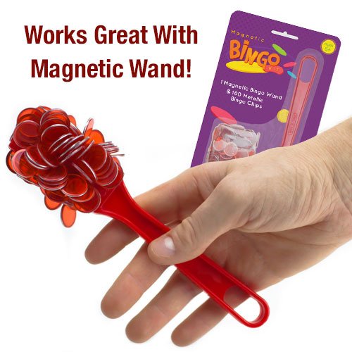 Available colors include red, green, purple or blue. When used with a magnetic bingo wand (sold separately) these chips are easy to collect. There is no more mess, no more hassle and no more lost chips!