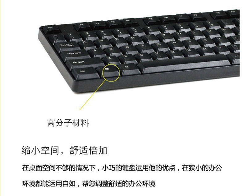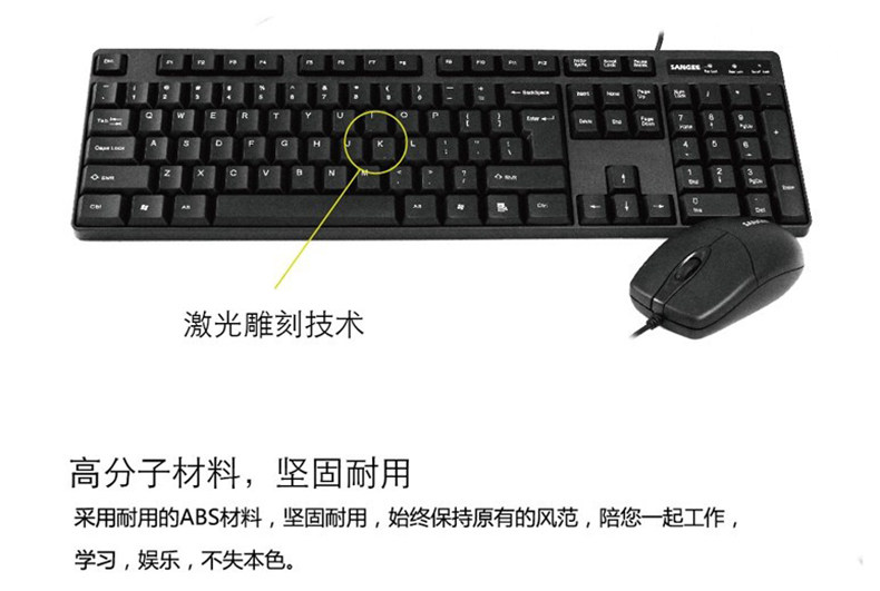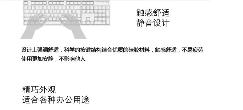 ●键盘底部密布大口径漏水孔,有助迅速排出溅在键盘上的液体,防止键盘受到意外溅洒的损坏●键帽通过激光雕刻技术印刷,字符清晰,长时间使用字符不脱落●ABS原料,坚固耐用。小巧外形,可在有限空间营造舒适状态●采用先进的光学引擎,分辨率高达1000DPI,定位精准●鼠标内置配重铁块,提供稳定的移动体验,从而提高操作的精准度●300万次按键使用寿命