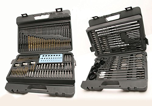 -. Feature : Contains: 42 alloy steel twist drill bits with black oxide finish: 4 each 1/32", 1-1/16", 5/64", 3/32", 7/64", 1/8", 9/64", 5/32". 1 each 11/64", 3/16", 7/32", 15/64", 1/4", 17/64", 9/32", 5/16", 3/8", 7/8". 51 pcs alloy steel twist drill bit, fully polished and titanium coated: 5 each 1/32", 1/16", 5/64", 3/32", 1/8", 9/64" 6 each 3/16". 1 each 11/64", 7/32", 15/64", 1/4", 17/64", 9/32", 5/16". 3 alloy steel twist pilot hole drill bit with black oxide finish and 1/4" quick connect hex shaft: 1/16", 1/8", 5/32". 3 screw finders 1 drill gauge 10pcs chrome vanadium steel 2" screwdrivers: slotted 1/8", 3/16", 1/4", 9/32". Phillips: #1, #2, #3. Pozi drive pz1, pz2, pz3. Torx: T-10, T-15, T20, T25, T27, T30, T40. Square: #1, #2, #3. 11 pcs carbon steel masonry bits with carbide tips: 1/8", 5/32", 11/64", 3/16", 7/32", 15/64", 1/4", 17/64", 5/16", 11/32", 3/8". 3 pcs 11-3/4" long masonry bits: 5/16", 7/16", 1/2". 3 pcs drill stops: 1/8", 3/16", 5/16". 27 pcs chrome vanadium steel 1" screwdriver bits: Slotted 1/8", 3/16", 1/4", 9/32". Phillips: #1, #2, #3. Pozi drive pz1-pz2-pz3. Torx: T-10, T15, T20, T25, T27, T30, T40. Hex 1/8", 5/32", 3/16", 7/32". Square: 2 each #1, #2, #3.