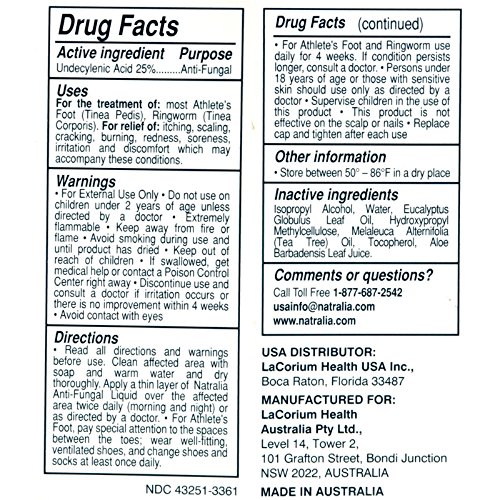 -. Binding : Health and Beauty -. Brand : Natralia -. Feature : With Aloe and Vitamin E to Moisturize, Soothe and Condition the Skin / Treats Fungus / Fast Drying / Natural Alternative / Made in Australia -. IsAdultProduct : 0 -. Label : Natralia -. Manufacturer : Natralia -. MPN : A2R141754 -. PartNumber : A2R141754 -. ProductGroup : Wireless -. ProductTypeName : HEALTH_PERSONAL_CARE -. Publisher : Natralia -. Studio : Natralia -. Title : Natralia Anti-Fungal Liquid - With Aloe and Vitamin E - Fast Drying - 1 fl oz (Pack of 2)