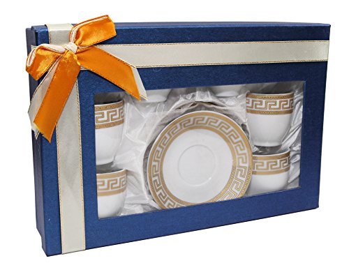 -. Feature : Six 4-Ounce Cups and Six Saucers / 12-piece Miniature Coffee Set / 24K Gold-Plated, Beautiful Greek Pattern Design / Sold in Solid Blue Gift-Box / Makes a unique and sophisticated gift