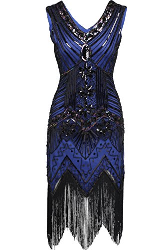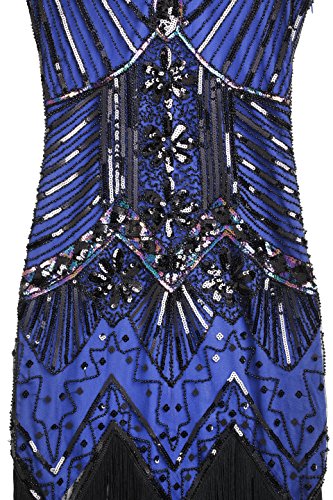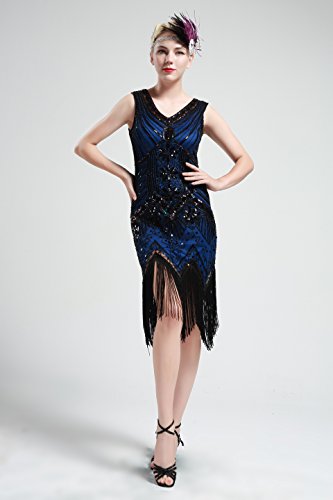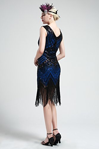 BABEYOND Women's Flapper Dresses 1920s V Neck Beaded Fringed Great Gatsby Dress (X-Large, Blue)
