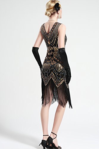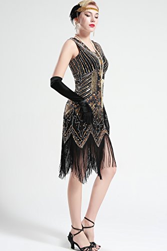 BABEYOND Women's Flapper Dresses 1920s V Neck Beaded Fringed Great Gatsby Dress (Large, Gold)