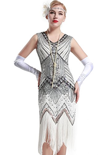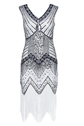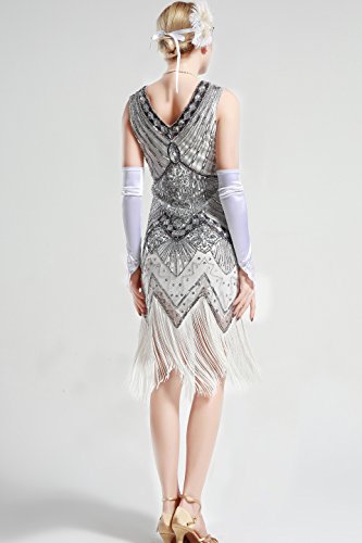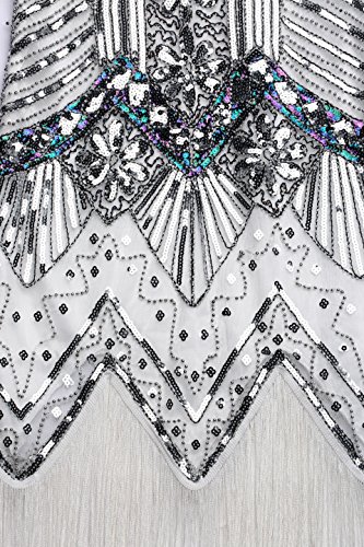 BABEYOND Women 1920s Gastby Sequin Art Embellished Beaded Fringed Flapper Dress Art Deco Dress (X-Large, Silver)