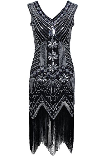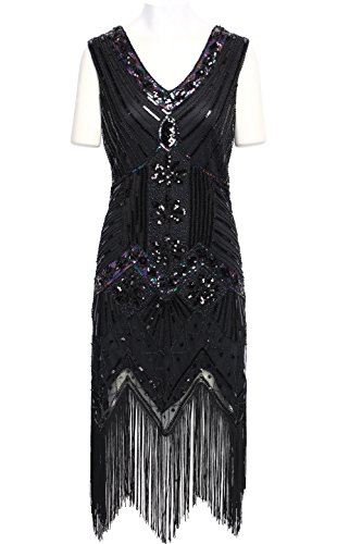 BABEYOND Women's Flapper Dresses 1920s V Neck Beaded Fringed Great Gatsby Dress (X-Large, Black)