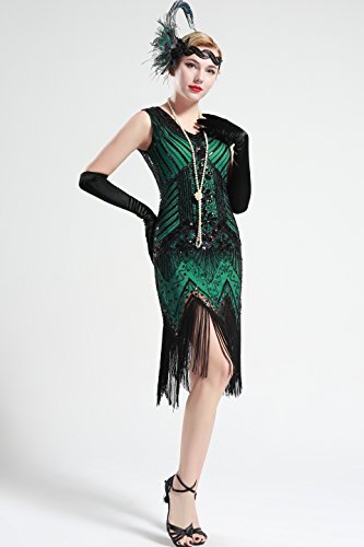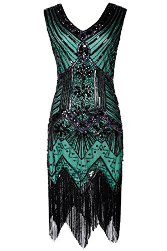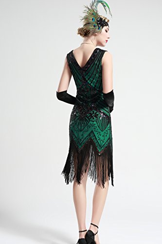 BABEYOND Women's Flapper Dresses 1920s V Neck Beaded Fringed Great Gatsby Dress (X-Large, Dark Green)