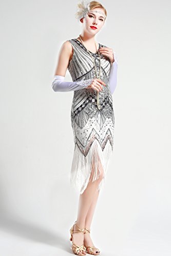 BABEYOND Women 1920s Gastby Sequin Art Embellished Beaded Fringed Flapper Dress Art Deco Dress (Small, Silver)