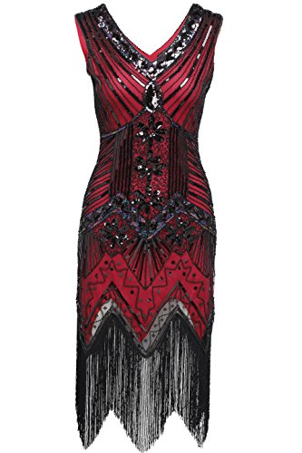 BABEYOND Women's Flapper Dresses 1920s V Neck Beaded Fringed Great Gatsby Dress (Small, Red)
