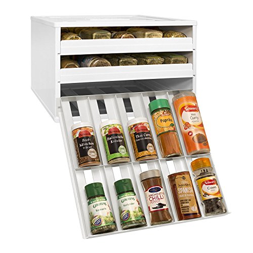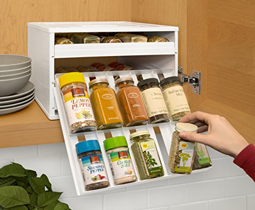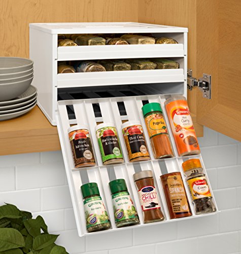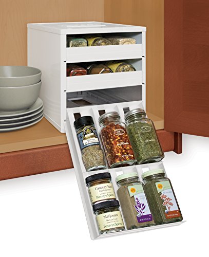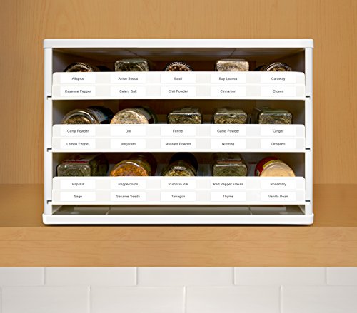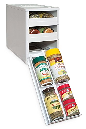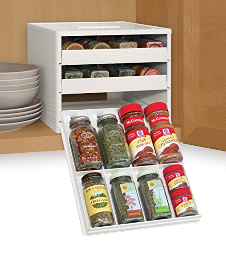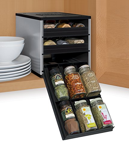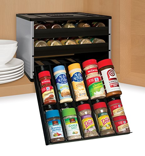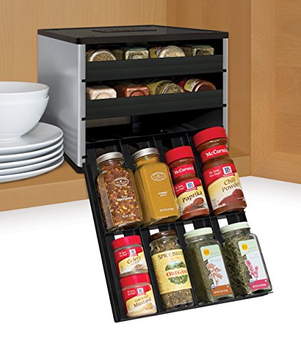 The Chef's Edition SpiceStack organizes 30 full-size or 60 half-size spice bottles neatly in your kitchen cabinet. This clever spice rack features three drawers that pull straight out and lower to resting position to display spice bottle labels at eye-level, so you can easily find and reach all your spices in a snap. Patented drawer design accommodates both round and square bottles. Your SpiceStack includes 48 pre-printed and 48 blank drawer labels for custom organization. Nonslip feet and stackable. Turn a jumbled mess into organized success with SpiceStack!Feature