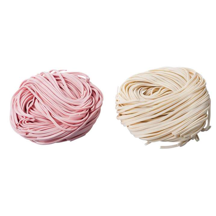 ●紅白の麺(うどん)を丸い形で仕上げました。従来の棒状の乾麺に比べて変わった形なので話題性もあります。茹でてお召し上がりいただければ普通のうどんと変わらぬ喉越しとコシがあります。重量も約200gなので手荷物にならず便利です。