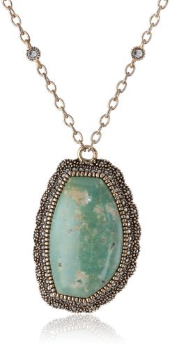 Genuine natural green turquoise is abstract cut and surrounded with black diamond Swarovski Elements black diamond crystals. More Swarovski crystals are interspersed in the necklace.