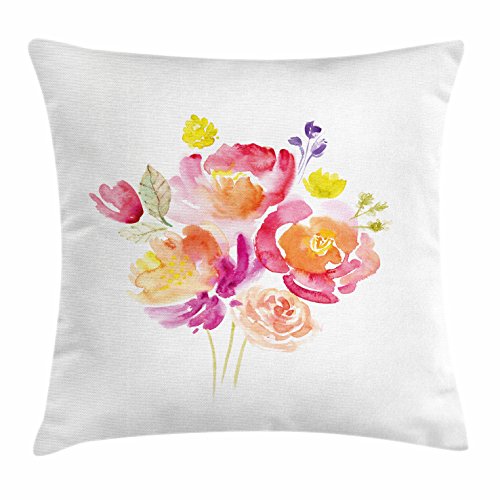 Pastel Throw Pillow Cushion Cover by Ambesonne, Watercolor Bouquet of Roses Romantic Artistic C...