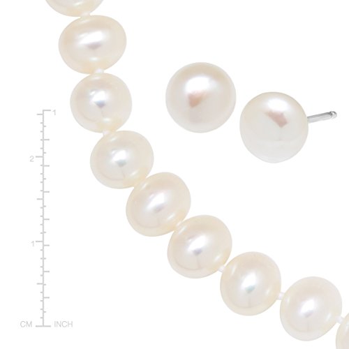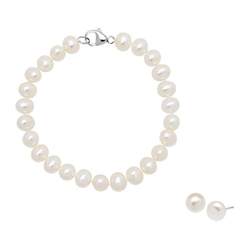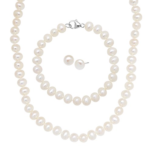 Tie your whole look together with this cultured pearl set! 6-7 mm freshwater cultured pearls line the necklace and bracelet while the stud earrings measure 7-8 mm. Earrings measure 1/4 by 1/4 inches. Necklace measures 18 inches in length. Bracelet measures 7 1/2 inches in circumference. Pearls have been bleached to enhance their appearance.Feature