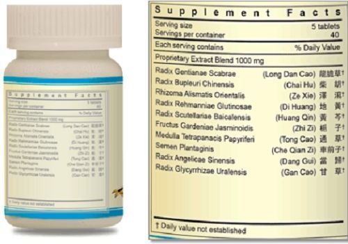 A proprietary blend of Radix Gentianae Scabrae Radix Bupleuri Chinensis Rhizoma Alismatis Orientalis Radix Rehmanniae Glutinosae Radix Scutellariae Baicalensis Fructus Gardeniae Jasminoidis Medulla Tetrapanacis Papyriferi Semen Plantaginis Radix Angelicae Sinensis Radix Glycyrrhizae Uralensis