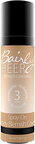 Bairly sheer body coverage offers lightweight, blendable and high-intensity coverage for skin blemishes ranging from hyper-pigmentation, age spots, bruises, tattoos, varicose veins and more. Bairly sheer body coverage blends effortlessly and looks flawless providing the ultimate buildable coverage without feeling heavy. The secret is a soft-spray that's easy to apply, blends naturally with surrounding skin, and lasts up to 18 hours.