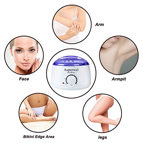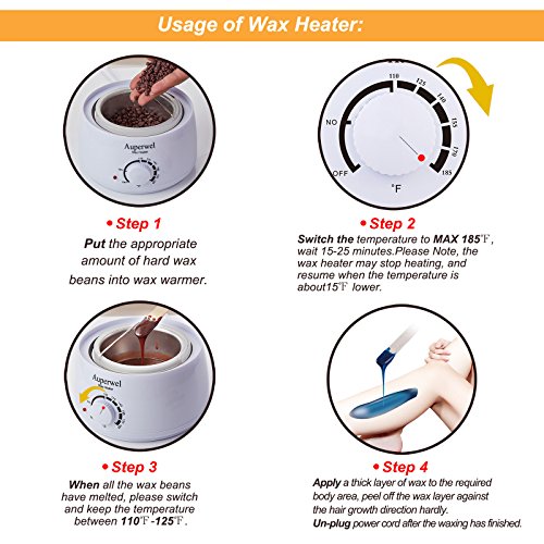 Usage of Auperwel wax warmer: Step 1. Switch the temperature to MAX 185?F, wait 15-25 minutes for the hard wax to melt. Please use a spatula to stir wax to accelerate the melting. Step 2. When all the wax beans have melted, please switch on constant temperature between 110?F-125?F. Step 3. Carefully test a little wax on waist for a suitable temperature, then apply a thick layer of wax to the required body. Step 4. Unplug the power cord of wax warmer after the waxing was finished.
