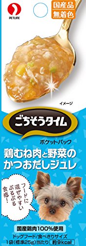 原材料:鶏むね肉、にんじん、とうもろこし、グリーンピース、寒天、カツオエキス、上白糖、乳酸カルシウム、増粘多糖類