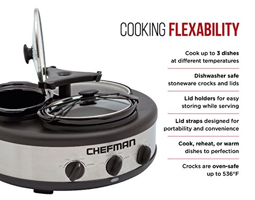The Chefman Triple Slow Cooker & Buffet Server is the perfect tool for multiple dish cooking and has become a holiday favorite! With three 1.5 quarts (total capacity 4.5 qt) removable crocks, you can make three meals at once, enjoying the ease and convenience of takeout with the comfort of a home cooked meal. With 3 individual heat settings, you can slow cook your food on high, low, or warm. Whether you are preparing for thanksgiving or Christmas, cooking for picky eaters, or simply planning weekly dinners, this is the ultimate way to bring versatility to your kitchen. No more slaving over the stove or heating up your kitchen with an oven left on all day, this slow cooker is an energy efficient and convenient way to make your favorite home cooked recipes while you sit back and relax. No need to worry about the cleanup either - the removable crock pot insets and glass lids are dishwasher safe. Cool-touch handles are convenient for transporting your prepared dish from counter to table, while tripling as a serving piece. Making home cooked meals has never been so easy!Feature