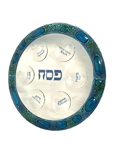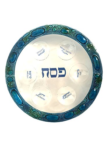Glass Seder Plate for Passover Hand Made in USA! 13" Round Clear Art Glass with Mediterranean Sea Design Blue English and Hebrew Lettering