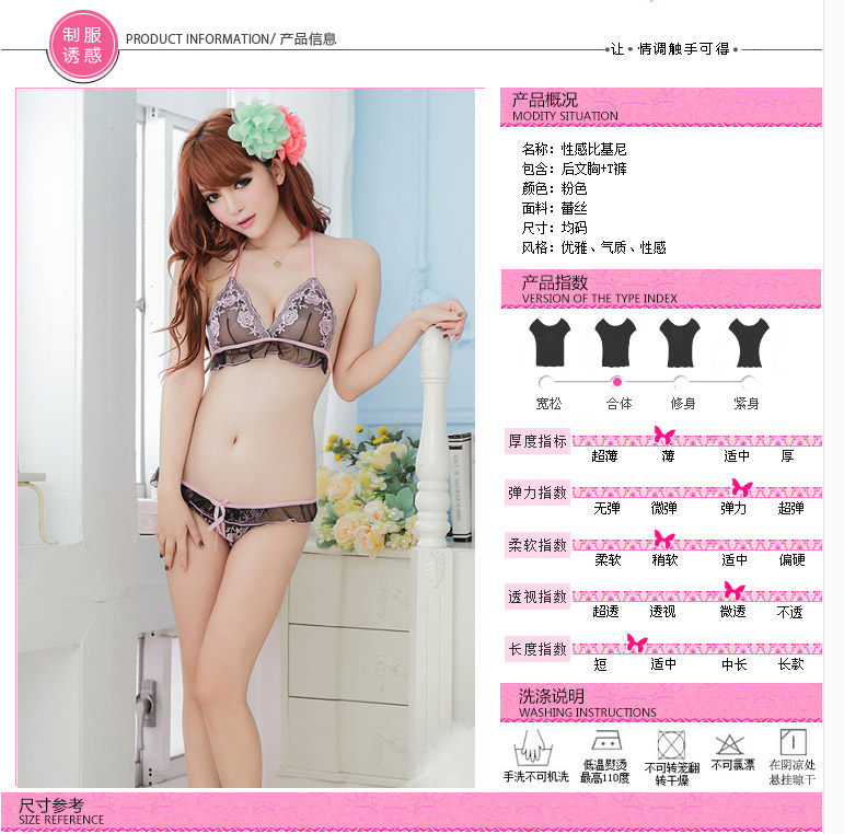性感蕾丝女士三点式情趣内衣 可爱粉色比基尼套装 诱人开裆内裤