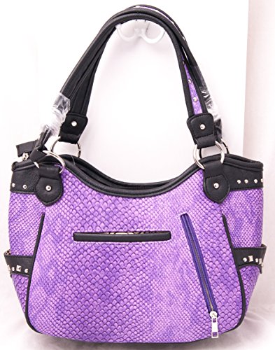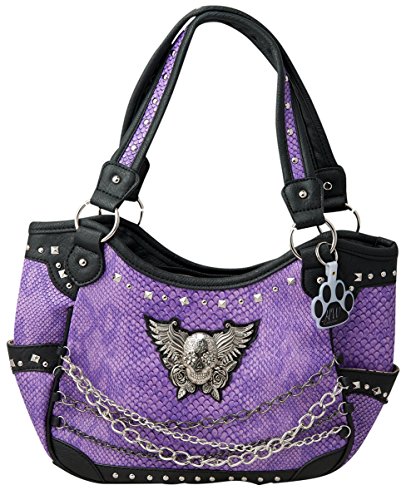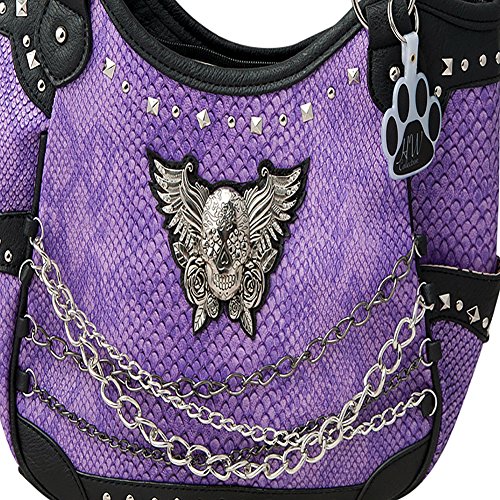 Product Description Made from high quality premium faux/imitation PU croc print leather handbag is decorated with silvertone sugar skull with roses and wings, silvertone studs, 4 hanging metal chains, and detachable HW Collection key ring/purse charm on the front. Secure your possessions with its zip top closure. Spacious and designed to keep you organized with its single compartment fabric lined interior divided with a medium zippered pocket, front wall that has 2 open pouch pockets and a zippered wall pocket on inside rear. One secure zippered pocket on the back for a concealed carry handgun (9 inches long x 6 inches tall) and one open pocket that can fit 5 inch phone. Double flat handles. Two open side pockets that can store your tissues, lipstick or any items you need to access quickly and easily. Metal feet on the bottom to keep the bag clean, protected and stable. Suitable for work, shopping, vacations, evenings out with friends or just to stand out and show off your western bling style and celebrate the day of the dead. 14 inches long X 10.25 inches tall x 4.5 inches wide.(10 inch drop). 0