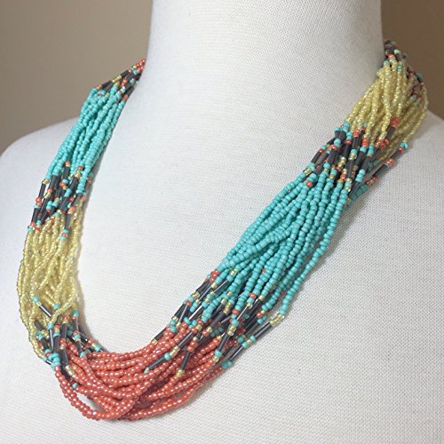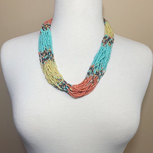 Multi Row Layered Seed Bead Statement Necklace and Dangle Earring Set (Peach Light Blue Yellow)