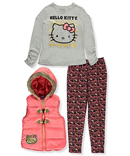 Cute and comfy, this Hello Kitty 3-piece is sure to sweeten up her look! Hello Kitty 3-piece outfit Weather-resistant vest with full insulation, zipper, metallic toggle closures, fleece lining, faux fur trim, and logo applique (100% polyester) Jersey long-sleeved T-shirt with metallic graphic (60% cotton, 36% polyester, 4% spandex) Printed stretch jersey leggings with elastic waistband (60% cotton, 36% polyester, 4% spandex) Machine wash cold, gentle, inside out ImportedFeature