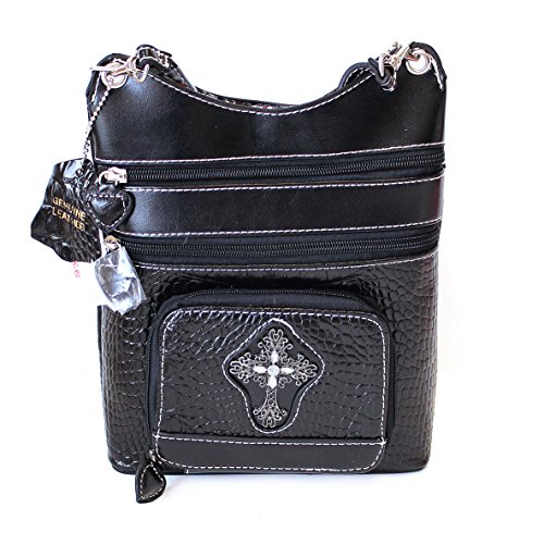 Women Western Fashion Antique Silver Metal Cross Rhinestone Genuine Leather Crossbody Handbag Crossbody Bag (BLACK/BLACK)