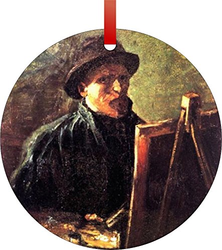 -. Title : Vincent Van Gogh's Self Portrait with an Easel-Round Aluminum Christmas Ornament with a Red Satin Ribbon/Holiday Hanging Tree Ornament/Double-Sided Decoration/Great Unisex Holiday Gift!