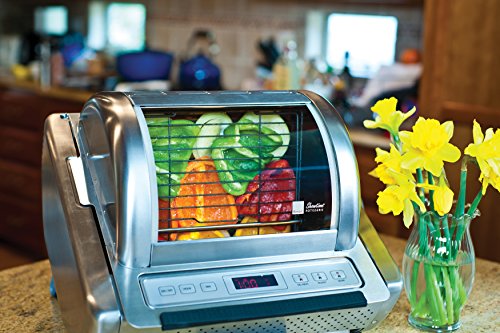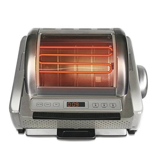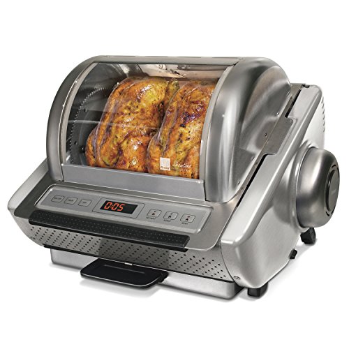 Compact Rotisserie Oven for Chicken, Turkey and other entrees with unique nesting design for easy storing;Precise rotation speed allows self-basting and efficiently circulates heat to cause excess grease and fat to drip away;Glass door allows you to monitor cooking progress;The digital timer makes the Ronco Ez Store Rotisserie easy to use and automatically turns off when the time is up;Includes the Multipurpose Basket, Rotisserie, Spit, Carving Platform, Removable Drip Tray, Oven Gloves and Food Ties