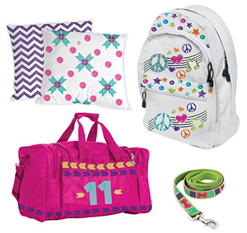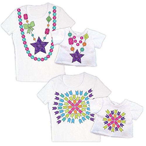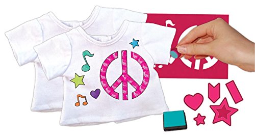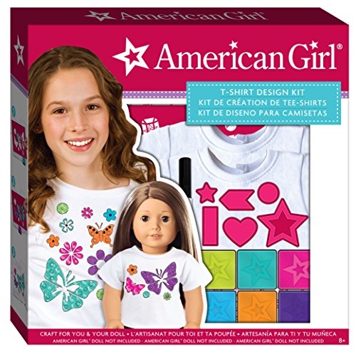 Create and design t-shirts for you and your doll with the American Girl T-shirt Design Kit by Fashion Angels. Use the stencils to make intricate designs or create custom artwork with the fun-shaped stamps. Decorate your finished products with the black fabric marker. Set includes 2 doll t-shirts, stamps, ink pads, stencil sheets, fabric marker and instructional design guide. Recommended ages 8 and up with adult supervision.Feature