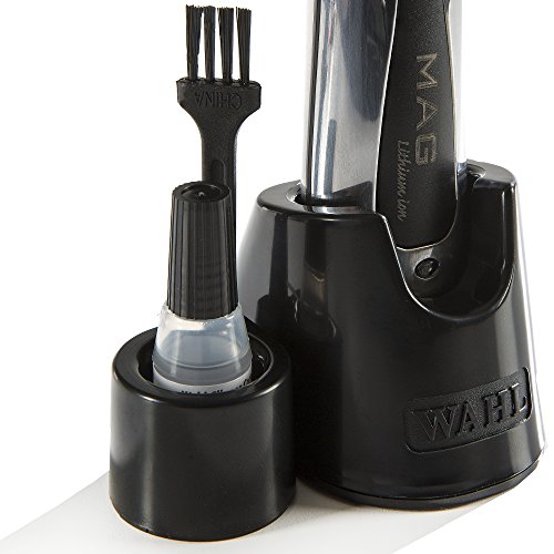 ACCESSORIES INCLUDED: Wahl Professional Sterling Mag Trimmer includes professional trimmer, automatic recharge stand, accessory storage well that attaches to either side of the stand, recharging transformers, 4 trimming guides (1/8” – ½”), oil, cleaning brush, operating instructions, and red blade guard, all of which are guaranteed for professional quality in your salon.