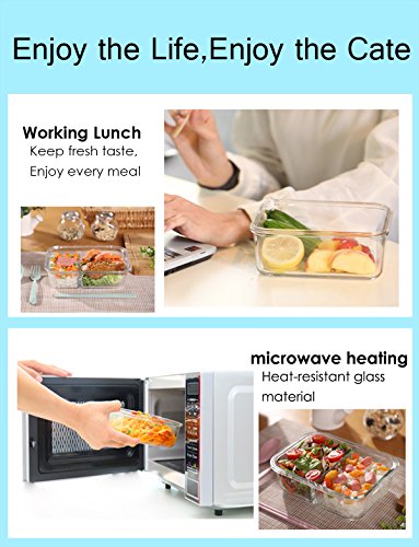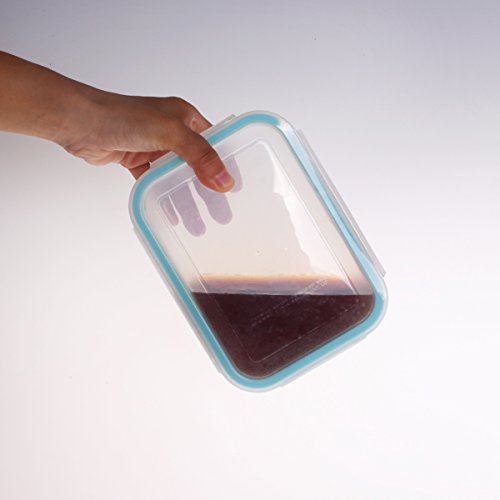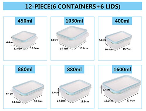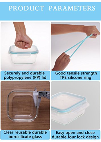 - 12 PIECES GLASS FOOD CONTAINERS WITH BPA FREE PP LID: 6 Containers + 6 Snap Locking Lids.The set of clear, reusable and extremely durable containers made of highly durable borosilicate glass with polypropylene (PP) lid.No fear of leaching chemicals.Great for travel and storing leftovers.Size is 4 rectangle containers, 14oz,30oz,30oz,54oz; 2 square,15oz,35oz.
