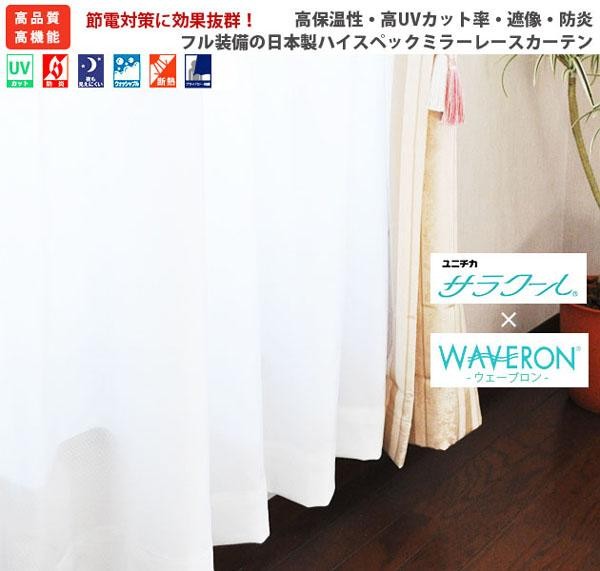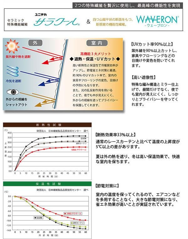 | 特殊機能糸「サラクール」と「ウェーブロン」をダブルで使用し、UVカット率90%以上、高い断熱性能、保温効果による節電省エネ、さらには高い遮像性によるプライバシー保護、防炎加工と今求められている機能をフル装備したハイスペックな機能性が魅力です。柄は合わせやすい無地プレーンとさりげなく主張する花柄をご用意。生地から縫製まですべて日本製の高品質・高機能なミラーレースカーテンです。 |