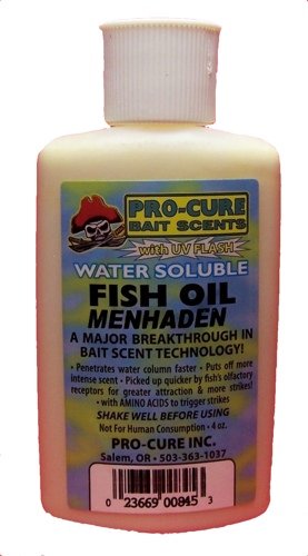 -. Binding : Sports -. Brand : Pro Cure -. EAN : 0023669008453 -. Feature : The bait scent of the future is here / Penetrates water column instantly / Puts off a massive scent trail / Brings fish right to your bait / UV enhanced -. Label : Pro-Cure -. Manufacturer : Pro-Cure -. Model : WS-MEN -. ProductGroup : Sports -. ProductTypeName : SPORTING_GOODS -. Publisher : Pro-Cure -. Studio : Pro-Cure -. Title : Pro-Cure Menhaden Water Soluble Fish Oil, 4-Ounce -. UPC : 023669008453
