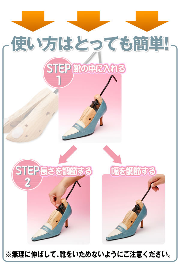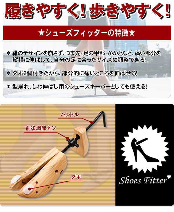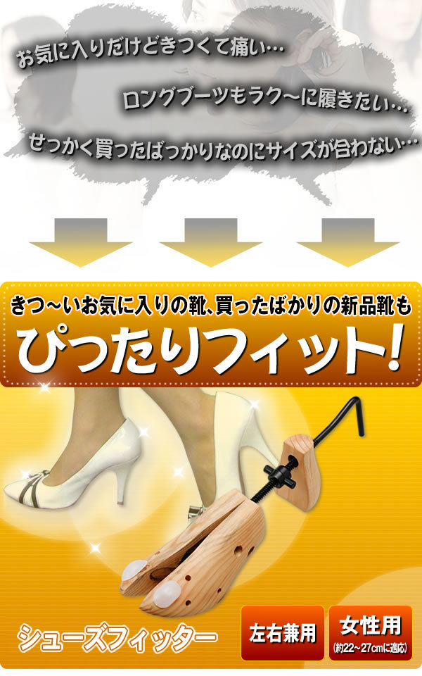 | <h1>足元快適♪パンプスもスニーカーも簡単調節可能!お気に入りの靴のデザインはそのまんま!痛い部分を縦横に伸ばして、自分の足に合ったサイズに☆シューズキーパーとしても使える!</h1> |