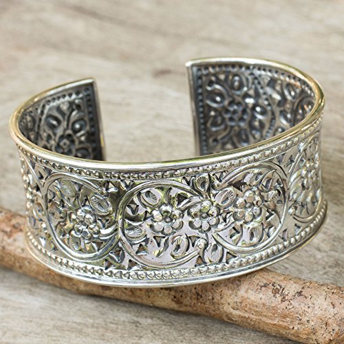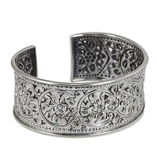 -. Binding : Jewelry -. Brand : NOVICA -. Department : womens -. Feature : An original NOVICA fair trade product in association with National Geographic. / Includes an official NOVICA Story Card certifying quality & authenticity. / NOVICA works with Achara to craft this item. / Includes an original NOVICA jewelry pouch to keep for yourself or give as a gift. / A keepsake treasure designed to be loved for years to come. -. Label : NOVICA -. Manufacturer : NOVICA -. Model : 115504 -. MPN : 115504 -. PackageQuantity : 1 -. PartNumber : 115504 -. ProductGroup : Jewelry -. ProductTypeName : FINENECKLACEBRACELETANKLET -. Publisher : NOVICA -. Studio : NOVICA -. Title : NOVICA .950 Silver Handmade Cuff Bracelet with Floral Motif, 6.25", 'Renewal'
