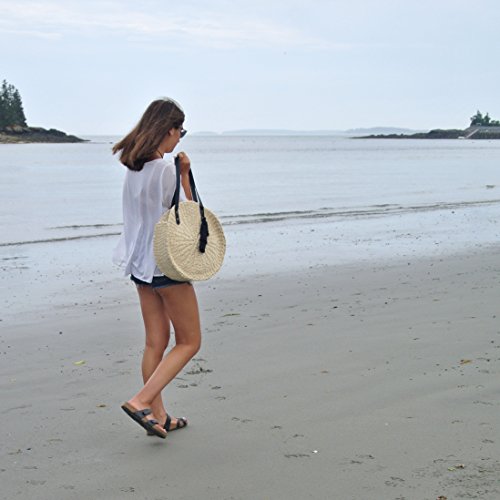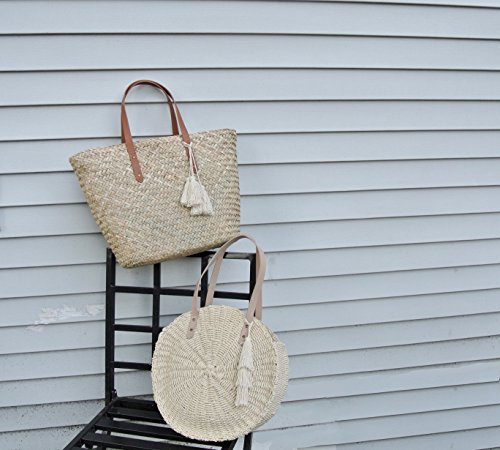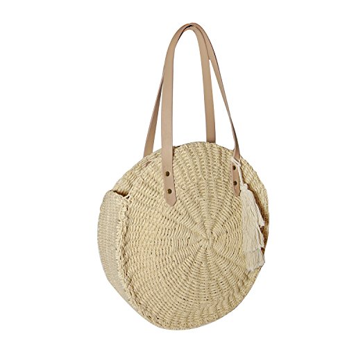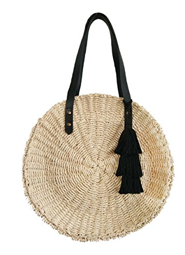 Circle Straw Bag Round Womens Shoulder Tote Leather Handle with Tassel