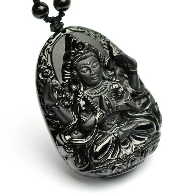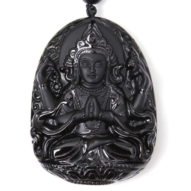 开光 天然黑曜石四臂观音吊坠黑曜石文殊菩萨吊坠