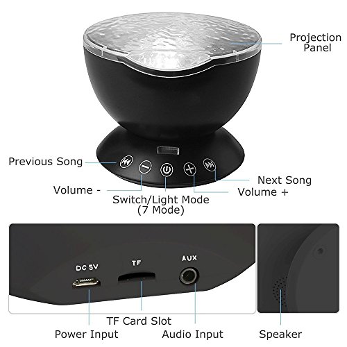 7 COLORS MODES & BUILT-IN MUSIC PLAYER: Bring the seaside home to you, give yourself a piece of the (ocean) in multiple changes of color to create a relaxing, romantic atmosphere. Built-in mini speaker, simply plug it into your phone, mp3, computer to play music or insert a TF card, also comes equipped with 4 built-in lullaby songs.
