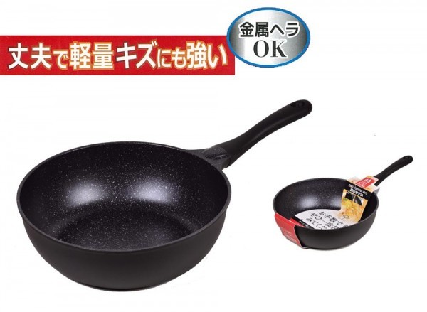 アルミ鋳物製で軽量を実現し、金属ヘラも使えるマーブル加工を施したいため鍋です。